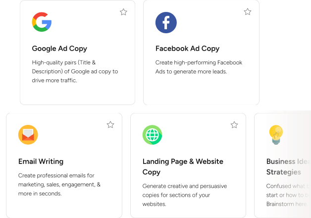 Schnell und einfach: Erstellen Sie Marketing-Inhalte in nur wenigen Minuten Hochwertig: Unsere KI-Tools sorgen dafür, dass Ihre Inhalte professionell und ansprechend sind Zielgruppenorientiert: Passen Sie Ihre Inhalte an Ihre Zielgruppe an, um die besten Ergebnisse zu erzielen Preiswert: Wählen Sie aus verschiedenen Abonnementmodellen oder kaufen Sie Credits, um auf unsere Dienste zuzugreifen Vielseitig: Erstellen Sie eine Vielzahl von Inhalten, darunter Blog-Beiträge, Social-Media-Posts, Website-Texte, Produktbeschreibungen und mehr
